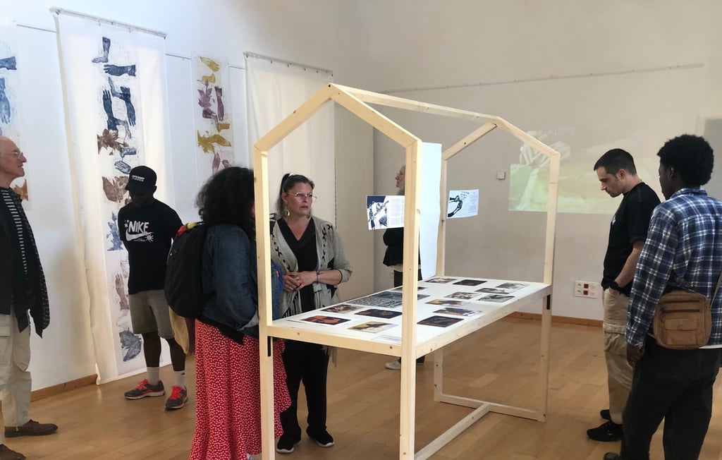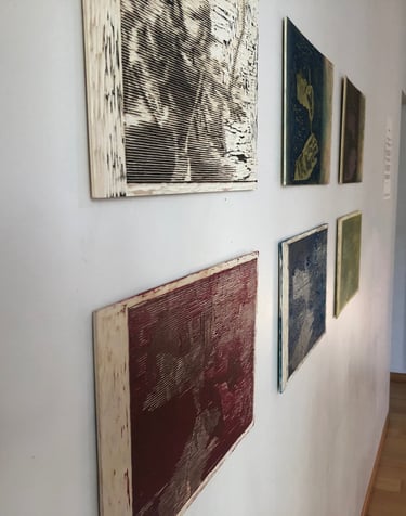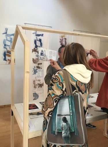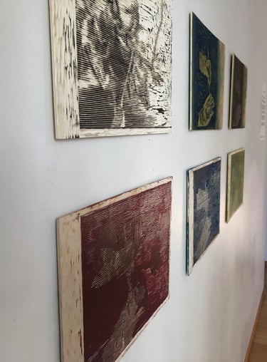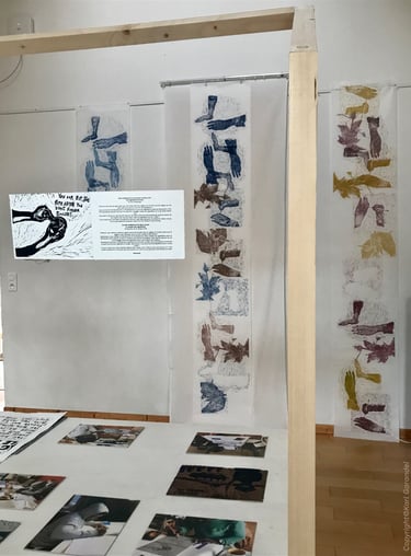 Prises de vue de l’ exposition. Production personnelle de gravures sur bois et de tirages sur lés de papier. Mise en valeurs des dessins et des gravures de jeunes non reconnus mineurs.