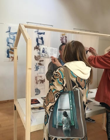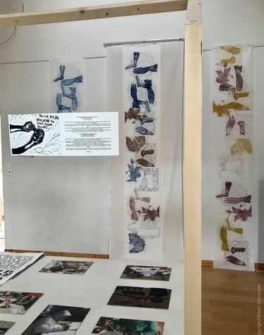 Ce dispositif de création partagée et de transmission a nourri ma pratique personnelle. J'ai retranscris graphiquement mon regard sur l’exil par une iconographie inventée du déracinement.