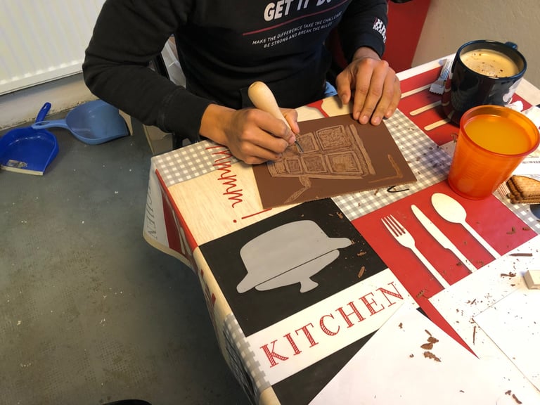 Prises de vue des étapes de réalisation des gravures et des impressions pendant les ateliers.