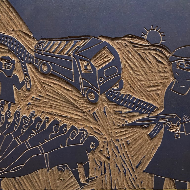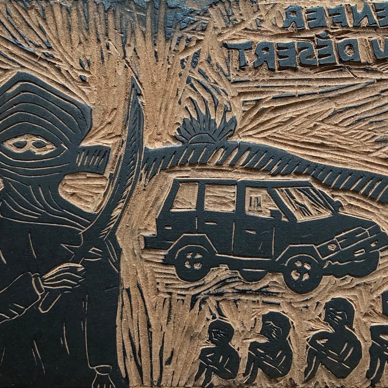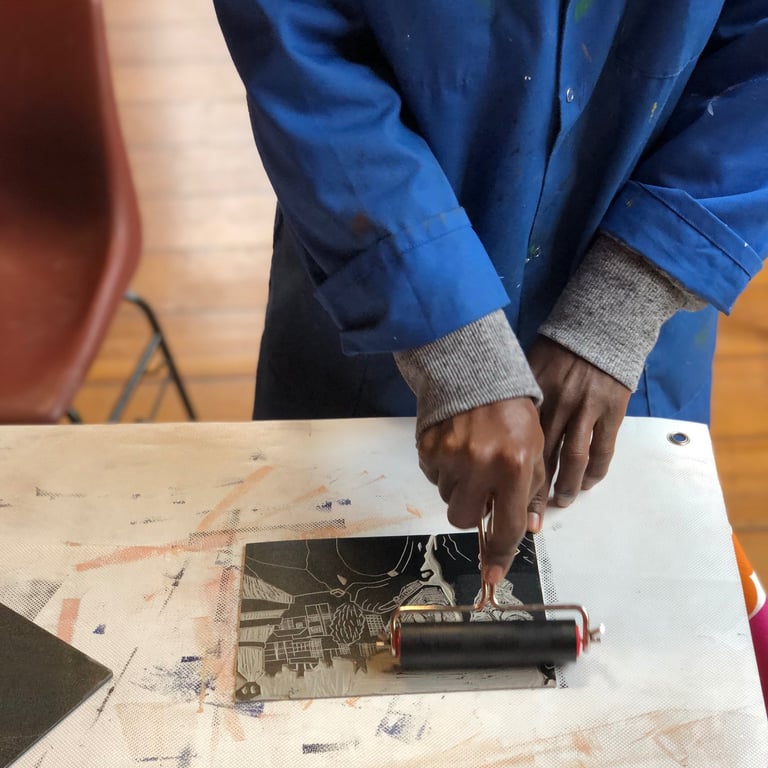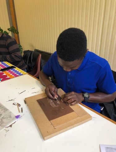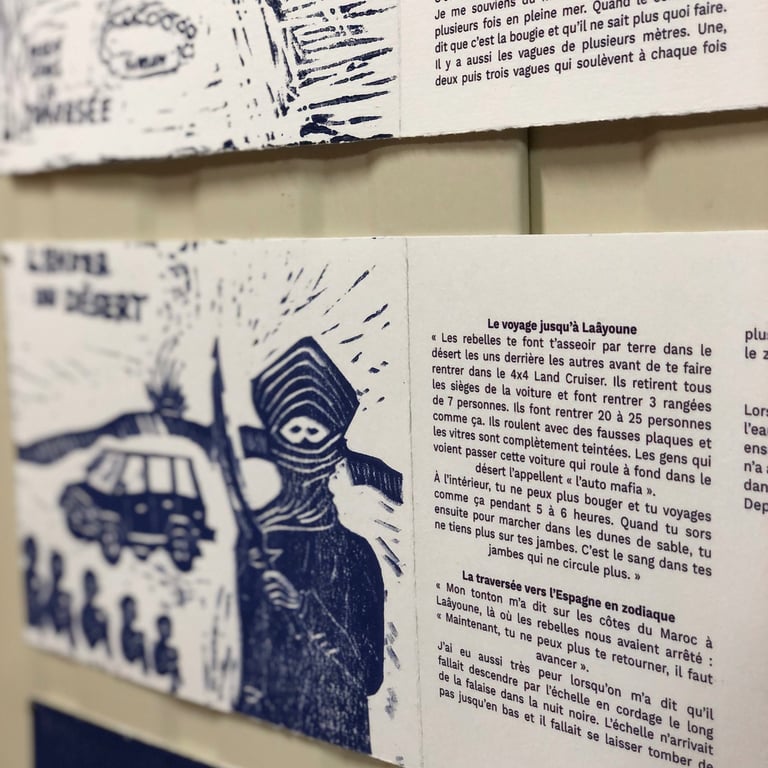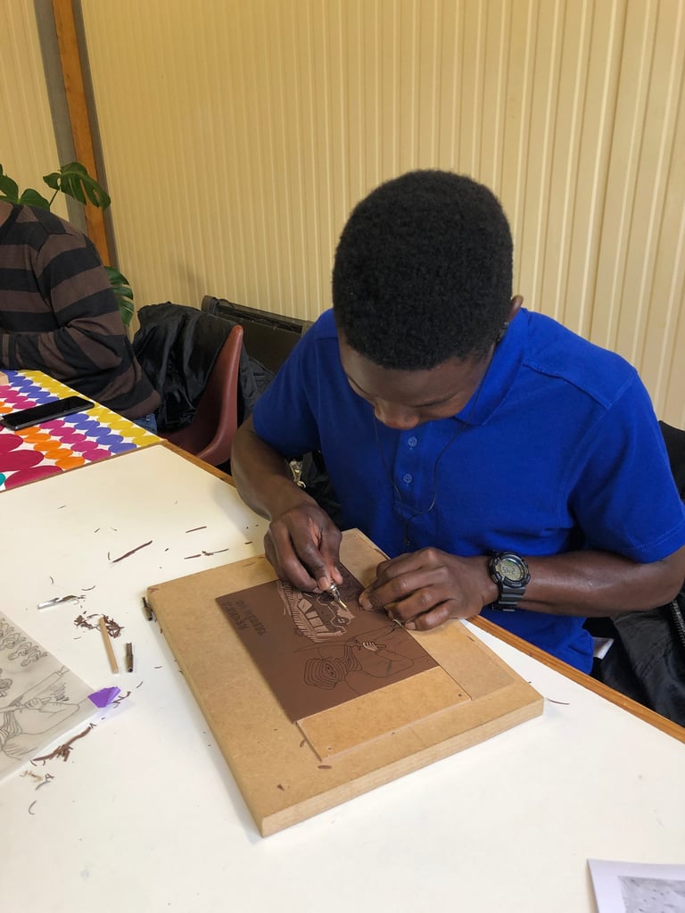 Dans le cadre de ma résidence aux ateliers de la Maison de Quartier Madeleine Champ de Mars, je suis aller à la rencontre de différentes associations du quartier qui viennent en aide à des personnes jeunes en situation d’exil pour proposer des temps de médiation et de création partagée. La transmission d’un nouveau mode d’expression tel que la gravure a permis aux personnes de parler d’eux d’une manière détournée et de partager leur vécu et leur culture.